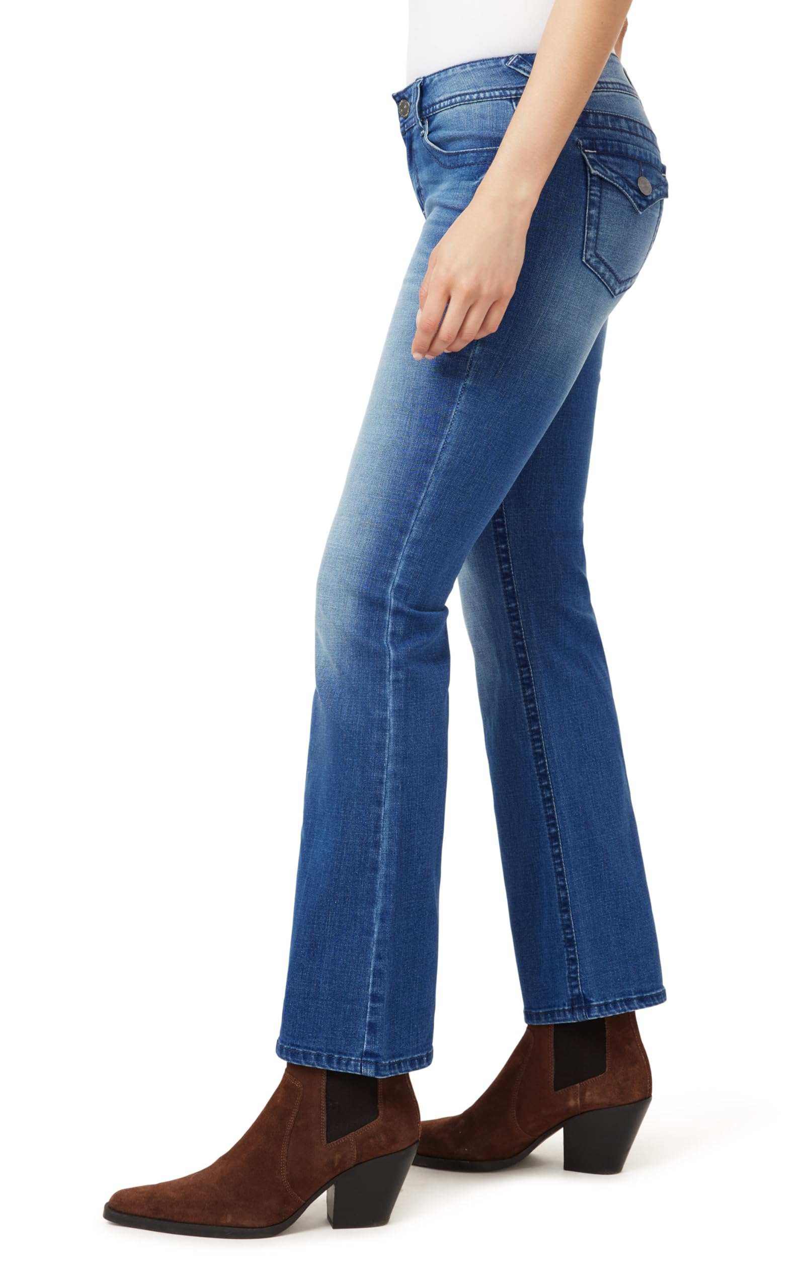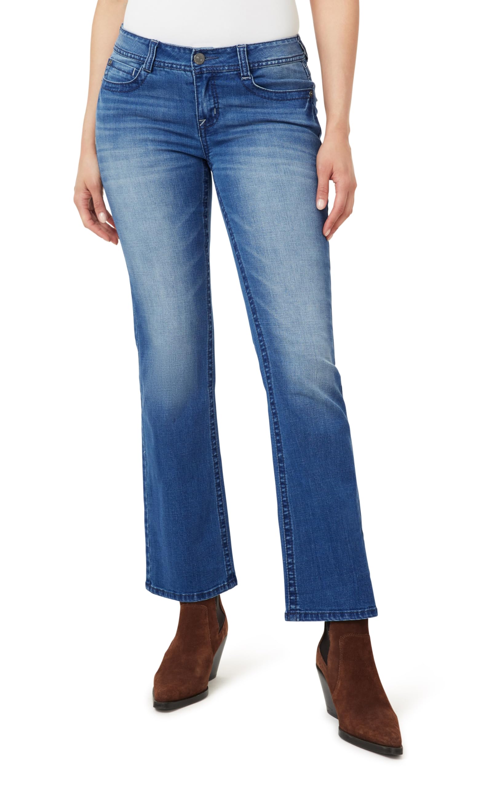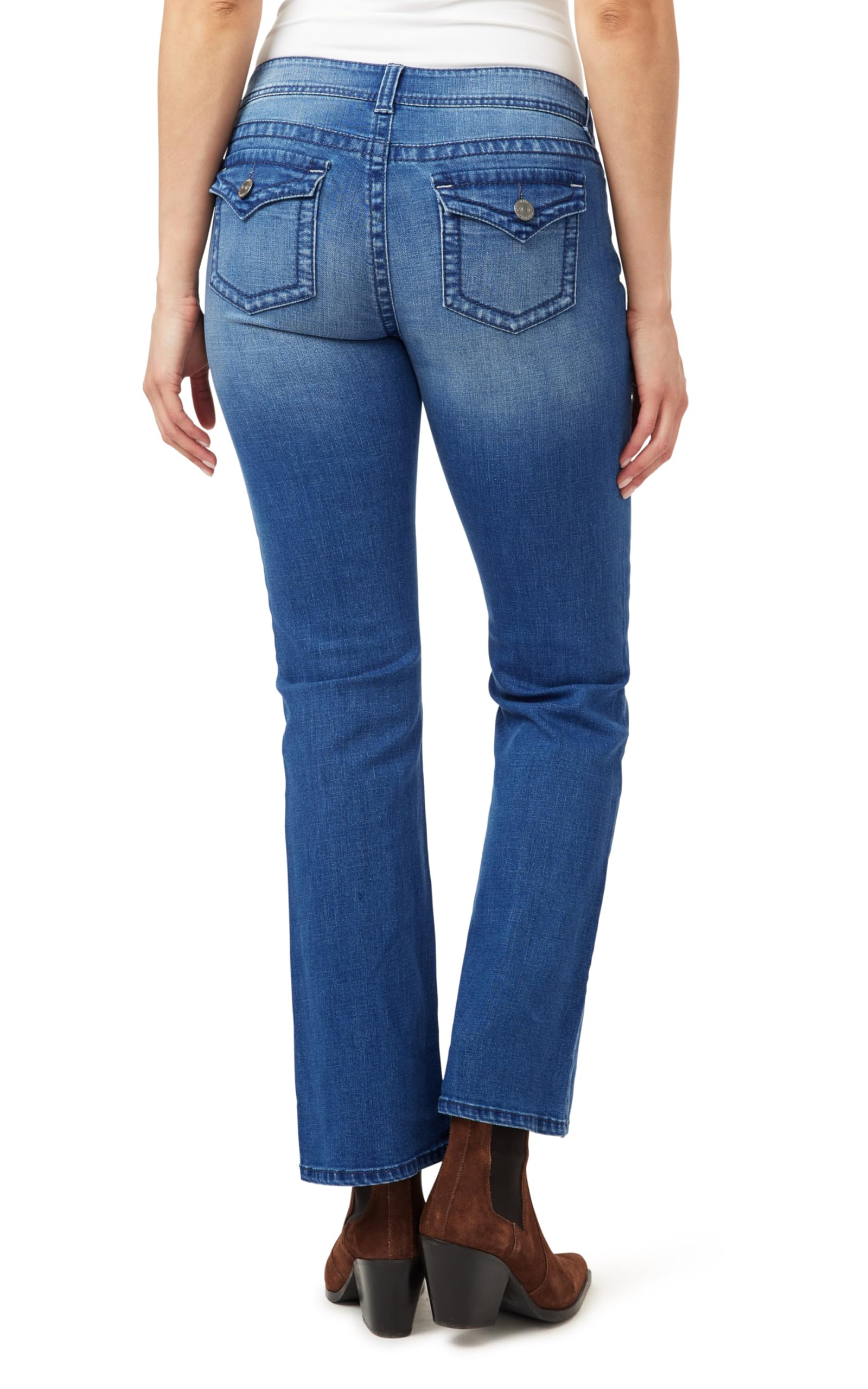 These jeans feature a medium wash denim look with soft fading and bold contrast stitching for a classic everyday style. The fitted upper leg and bootcut silhouette create a flattering shape that pairs easily with boots, heels, or casual tops.